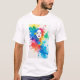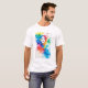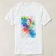 Design a shirt graphic that embodies a playful and artistic vibe, featuring a colourful paint splatter or brushstroke theme. Use a mix of vibrant and bright colours like bold blues, energetic yellows, and lively reds to create a dynamic, abstract pattern. Include elements such as dripping paint, paintbrushes, or cheerful splashes to enhance the artistic feel. The design should be visually exciting and convey a sense of creativity and joy, ideal for a shirt that celebrates artistic expression and fun.