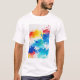 Design a shirt graphic that embodies a playful and artistic vibe, featuring a colourful paint splatter or brushstroke theme. Use a mix of vibrant and bright colours like bold blues, energetic yellows, and lively reds to create a dynamic, abstract pattern. Include elements such as dripping paint, paintbrushes, or cheerful splashes to enhance the artistic feel. The design should be visually exciting and convey a sense of creativity and joy, ideal for a shirt that celebrates artistic expression and fun.