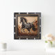 Experience the beauty of nature with our stunning wall clock featuring a Paint horse trotting through a sunlit field, beautifully framed by a sleek ½-inch flat black wooden border. The clock's design showcases deep carvings and textured grain with rugged burn marks in red, grey, and black, creating a striking contrast against the lighter wood appearance. This unique piece not only captures the essence of rustic charm but also offers the durability of non-wood materials, ensuring it remains a timeless addition to your decor.