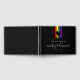 Charming lgbt wedding guest book with rainbow pride flag drawn with messy strokes and adorned with a black heart against a black background. Gay wedding guest book in black with a heart and rainbow brush strokes. Lesbian wedding guestbook with a heart on rainbow coloured brushstrokes.