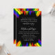 Formal LGBT wedding invitation in black with charming fonts and pride flag paint strokes framing the formal wedding wording in white text against a black background.