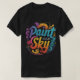 A playful t-shirt design with the text "Paint Your Sky" in a playful font, with colourful splatters and brushstrokes surrounding it.