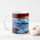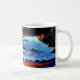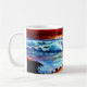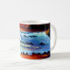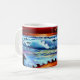 Evening waves crashing on the shore with a bright orange and red sunset.