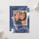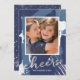 Spread cheer in the New Year with this modern holiday photo card featuring "cheers" in hand drawn script on an abstract painted background in faux silver foil and shades of blue. Photography © Storytree Studios, Stanford, CA