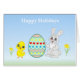 Easter bunny, chick and painted Easter egg Happy Holidays Card. Text can be personalised.