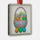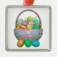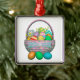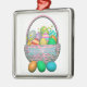 Metal hanging ornaments with my design of colourful painted Easter eggs in a pretty basket with text that says "Happy Easter".