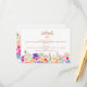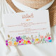 A modern, delicate hand painted garden wild flowers wedding details card, with hotels, honeymoon funds... in bright hues, pink, red, blue, yellow and green, with an elegant brush script font to celebrate your summer outdoor wedding in style.