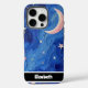 Showcasing a rich blue backdrop with visible, thick brushstrokes, this phone cover is adorned with artistic white stars and gracefully curved crescent moons hinting at dawn's colours. It offers a captivating celestial landscape for your device. A black bar at the base provides a space for personalisation with a name, like "Elizabeth"; should you wish, you can easily remove the name and any other design elements using our intuitive design tool, ensuring your accessory is perfectly customised to your taste