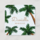 Elegant and feminine business card design featuring a beachy painted palm tree design on a light blue background.