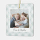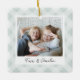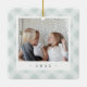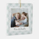 A sweet double sided photo ornament displaying a favorite photo on each side, on a handpainted neutral light plaid background in delicate colors. Personalize with a custom caption on the front in handwritten lettering, and add the year to the back.