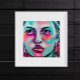 Artsy poster. Urban street art women's face AI generated art. Close up of face. Teal, white, pink and black colours.