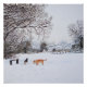 This original little snow scene landscape painting shows two mixed breed dogs, having fun in the fresh carpet of crisp snow. The brown and black dog is accompanied by his friend a german shepherd/ golden labrador cross breed dog, the two of them are gazing across the snowy landscape to the snow covered rooftops of the houses just below the hill. The two doggy friends have just been playing amongst the snow layden trees and they're taking a little breather from their doggy fun and games. This original value poster of two dogs in the snow makes a great little piece of landscape art to brighten any corner of your home or office. The original watercolour snow landscape painting is titled "Fun In The Snow" The scene is Woodford golf course in South Woodford on the edge of East London England.