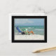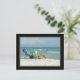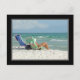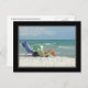 A postcard print watercolor painting showing a woman reading a book in a beach chair as the waves roll in on the shore.