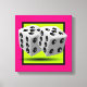 An illustration of a pair of white dice with black dots. Background is created with some groovy psychedelic neon colours in lime green and fuschia pink.