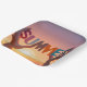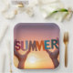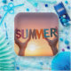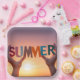 Hands are holding up colourful letters that spell "SUMMER" against a vibrant sunset backdrop