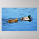 Male and female of mallard ducks (Anas platyrhynchos - Bird) in indian file swimming on blue water