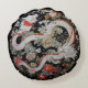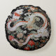 This round throw pillow features a pair of white Asian style dragons surrounded by flowers on a black background.