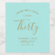 Minimalist "Pairs well with" personalised birthday wine bottle label in simple aqua blue and gold with modern, chic and elegant handwriting typography style. All text is customisable. Personalise with age, name and year of birth. Perfect for birthday gift or party favour.