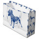 Happy Dog! A large-scale dog silhouette in blue and white paisley, on a white background.