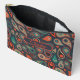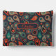 Cosmetic and accessory pouch that features a traditional paisley pattern with a modern twist. Bold colours, orange and green paisleys on a dark blue grey background.