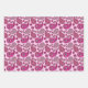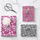 Wrapping paper in an ornate, lacy, paisley pattern in shades of light to deep fuchsia pink, accented with burgundy, on a pastel pink background, Black, white and grey on deep fuchsia pink, and black and white on a silver grey background