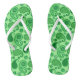 Flip flops in an ornate paisley pattern, in shades of emerald green and light to deep jade green, on a light jade green background background