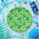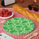 Paper plates in an ornate paisley pattern in shades of chartreuse to deep emerald green on a pastel lime green background