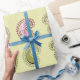 Elegant wrapping paper than can be used for many celebrations featuring a pattern of pink and green paisley graphics.