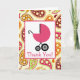 A baby shower thank you card featuring an illustration of hot pink baby carriage over a pink, green, gold, orange, and burgundy paisley background. Inside is blank.