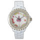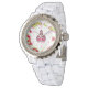 A watch for teachers featuring the logo of The Pink Schoolhouse at centre with pink and green paisley print border. Personalise with your name under schoolhouse. Numerals are pink and black.