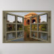 This design features a faux light brown wooden frame 6 pane window opening to a spectacular view of the Palace of Fine Arts in San Francisco.