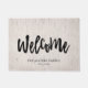 Rustic welcome mat printed to look like pale birch bark, with Welcome written in black brush script. Personalise with your family name and the year your family was established.