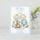 Cute blue and green watercolor baby shower invitations for twin boys. Cute watercolor twin boys with a blue balloon and teddy bear.