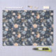 This design features a watercolor illustration of pale peach and blue blush flowers and tropical bird.