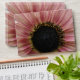 This envelope features a beautiful photograph of a pale pink sunflower. The sunflower is naturally pink and the petals have a pale pink outer ring and a darker pink inner ring. The middle where the seeds are is black. This photograph was taken in a garden.