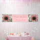 This awesome banner features a beautiful photograph of a pale pink sunflower. The sunflower is naturally pink and the petals have a pale pink outer ring and a darker pink inner ring. The middle where the seeds are is black. This photograph was taken in a garden.