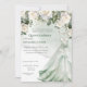 This elegant quinceañera invitation features a soft, romantic design with a delicate botanical theme. The top is adorned with lush ivory roses and muted greenery, accented by subtle gold speckles that add a touch of shimmer. A graceful watercolor-style ball gown in a soft sage green flows along the side, creating a refined and feminine focal point. The background has a gentle textured wash in pale green and ivory, providing a light, airy feel while keeping the center text area clean and easy to read. Classic serif typography in coordinating green tones enhances the timeless look, making this invitation perfect for a sophisticated and nature-inspired celebration.