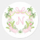 This sticker has a preppy grandmillennial design featuring pink and green Palm Beach preppy styled pool chairs and umbrellas surrounded by palm trees. The back has a pink and white cane webbing pattern. You can personalise with your monogram.
