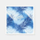 Paper napkins in a tropical print of overlapping palm leaf silhouettes, in shades of cobalt blue, navy / indigo, and white, against a light sky blue background
