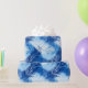Wrapping paper in a print of overlapping palm leaf silhouettes, in shades of cobalt blue, navy / indigo, and white, against a light sky blue background