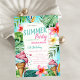 These invitations feature palm leaves with tropical flowers and ice cream on a blue background. This invitation is easily customised for your event by simply adding your details.