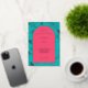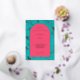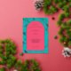 Pink arch over blue background. Border is palm leaves line art. Seashell illustration at centre.