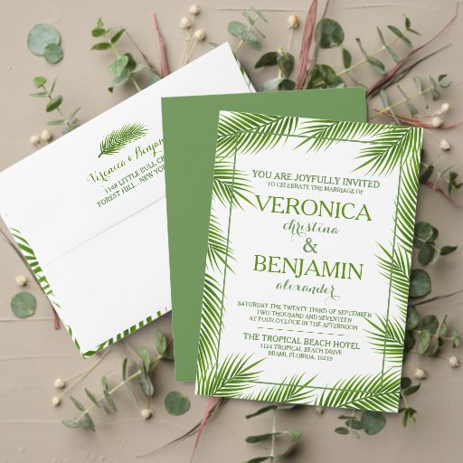The design features trendy tropical green palm leaves on a simple clean white background with a coordinated border and wording.