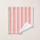 Pattern with illustrations of midcentury modern style houses, flamingos, cacti, palm leaves, and midcentury modern designs. Wash cloth features pink and green stripe design. Hand towel features midcentury inspired pattern over light blue background.