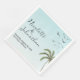 This custom napkin features a tropical theme for a destination or simple beach wedding. An image of a palm tree is pictured on the right, with a flock of birds flying above. The background is a sky blue gradient. The names of the couple are printed on the left in an elegant script font, followed by the wedding date and location.