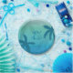 Paper plates for a tropical wedding featuring some blue palm tree silhouettes on an aqua blue background colour that is portraying a tropical ocean. In the middle there are customisable text fields for the names of the couple and for the date of the wedding.