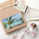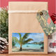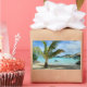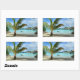 Rectangular photo sticker of a palm tree on sand beach of a luxury overwater thatched roof honeymoon resort on the tropical island Bora Bora, near Tahiti in the pacific archipelago French Polynesia.