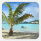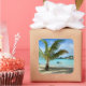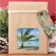 Souvenir photo sticker of a palm tree on sand beach of a luxury overwater thatched roof honeymoon resort on the tropical island Bora Bora, near Tahiti in the pacific archipelago French Polynesia.