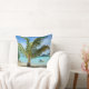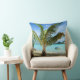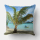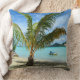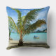 Throw pillow with a palm tree on sand beach of a luxury overwater thatched roof honeymoon resort on the tropical island Bora Bora, near Tahiti in the pacific archipelago French Polynesia. Great decoration!