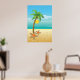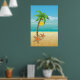 Palm tree and sun tropical scenery print/poster, featuring a tropical scenery: a palm tree with coconut on a sandy beach with starfish, blue sea/ocean water and the sky with the sun and clouds.
